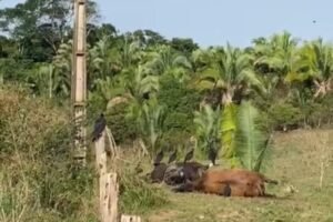 De acordo com o relato do morador Wendel Dadei, um poste de energia elétrica apresentou curto-circuito, danificando o arame da cerca da propriedade e resultando na morte de dois animais. “Na noite do dia 13, o poste pegou fogo, e o arame derreteu. Dois animais morreram em nossa propriedade. Na manhã do dia 14, registrei a ocorrência na Equatorial, mas até agora a situação não foi resolvida”, lamentou.
